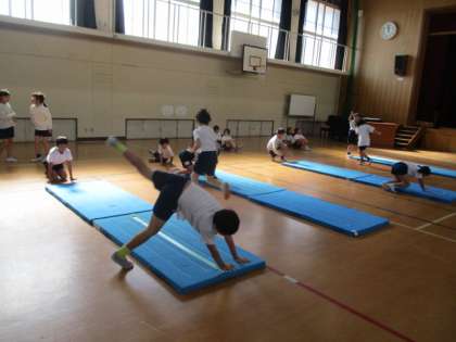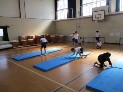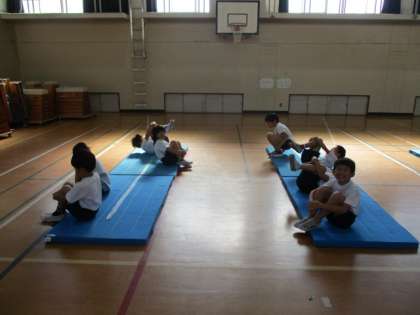体育科では、「マット運動」の学習が始まりました。今日は第1時でしたので、学習の流れや学習カードの使い方を確認した後、体育館に移動して体慣らしに取り組みました。「ゆりかご」「カエルの足打ち」など、2年生までにしてきたことをしました。前転や側方倒立回転などの技につながる大切な動きです。がんばっていきましょう!