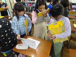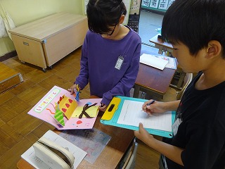 4年図工「カードでつたえる気持ち」完成したカードを見合って