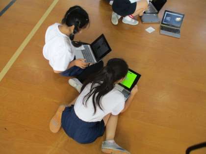 ねらい2では、「坂の場」「長いすの場」など、工夫した場の中から自分に合った場を選んで挑戦します。「ゴムの場」では、側方倒立回転やロンダートの足が上がっているのかを確かめていました。ギガ端末も活用して、技のコツを見ている子どももいました。自分に合った方法で、できる技をどんどん増やしていきましょう!