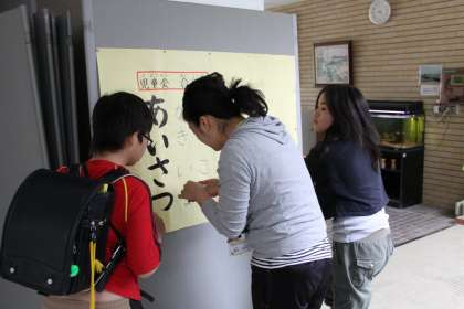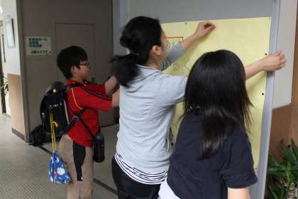 子どもたちが「自分たちからあいさつしよう。」と呼びかけています。