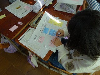 今回は、その中でみんなの投票で決めたクラス代表のアイデアをグループを作り、よいところや改善点、新たなアイデアなど、付箋にまとめて仲間分けをしながら、グループごとに交流しました。