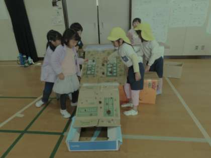 今日は第一弾。きらきら保育園の年長さんに小学校に来ていただき、あきまつりを開催しました。楽しそうに自分たちの作ったもので遊んでもらいました。