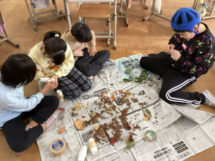 紙コップにどんぐりを入れて、楽器にしたり、いくつのどんぐりが入っているかとクイズを出したりして楽しみました。