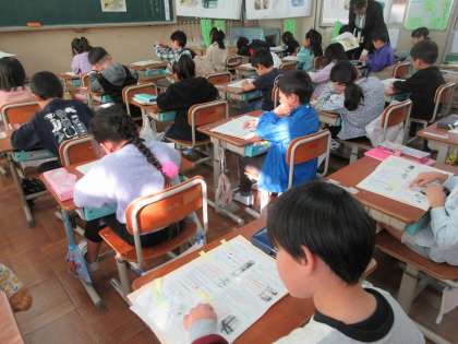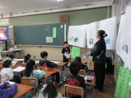 国語科の学習で「たぬきの糸車」のお話で、登場人物のしたことや思ったことを想像しながら読む学習をしています。