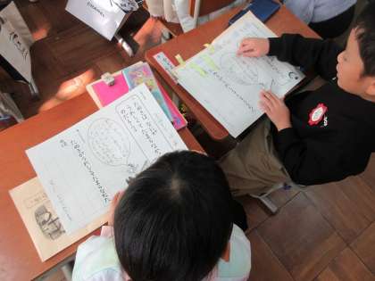 お話の文や挿絵を見ながら、登場人物になりきって吹き出しの中に言葉を入れたり、友達と考えを交流したりしながら考えを広げています!