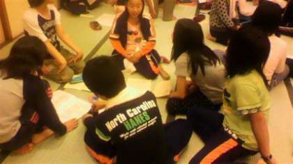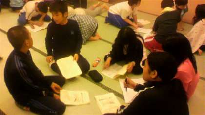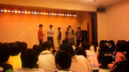 食事,入浴の後はお楽しみ会です。趣向を凝らしたレクリエーションでとても楽しい時間を過ごしました。その後,反省会を開き就寝となりました。1日目,とても楽しい時間を過ごせました。