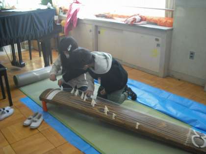 音楽の学習で、日本の音楽を聴いたり歌ったりしています。その中で、実際にお琴の演奏を体験しています。お琴の大きさが182cmあることや桜の木で作られていること、13本の限があることを教えてもらいました。また、つめは象牙でできていて革でできているベルトを使って指につけることなども知りました。実際に触ってみて、これから演奏の練習をしていきます。