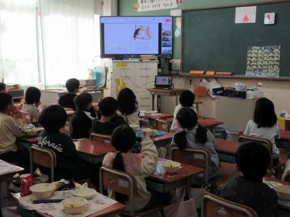 12月6日(金)の給食時間に、図書館司書の先生によるオンライン読み聞かせを行いました。