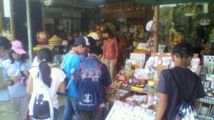 うどん作りの後,金毘羅さん見学へ出かけました。少々バテ気味でしたが,次の買い物と本場讃岐うどんの昼食を楽しみに,がんばっていました。本場讃岐うどんはやっぱりご当地で食べるのが一番。しっかり食べました。買い物も楽しい時間でした。