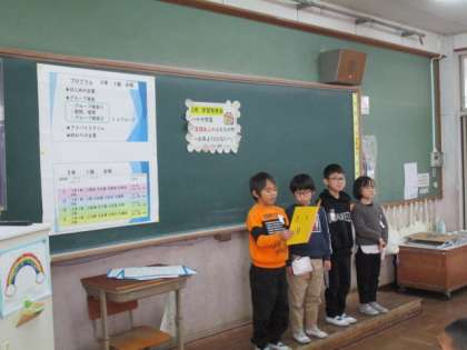 先週に3年生の学習発表会を行いました。当日は、4年生とお家の方々に見ていただき、もっとよいえがおプランにできるようにたくさんアドバイスをいただきました。初めの言葉やグループの発表など、3年生の力を合わせて頑張りました。緊張する中だったと思いますが、頑張りました。