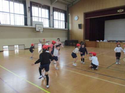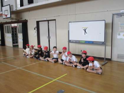 授業のはじめに、「体じゃんけん」「進化じゃんけん」を行いました。写真は、進化じゃんけんを勝ち抜いて、仙人になっている子どもたちです。