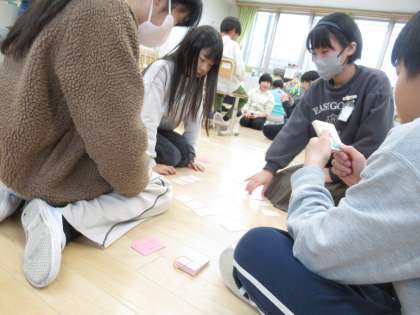 来週の百人一首大会に向けて、各クラスで練習に取り組みました。ルールを確認した後、色ごとに分かれて対戦をしました。読み札を読むのも子ども達が順にしていましたが、抑揚をつけてリズムよく読んでいて感心しました。