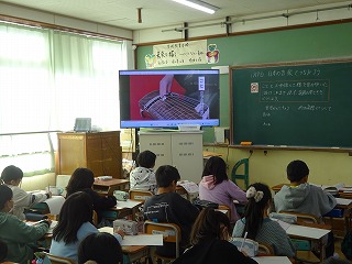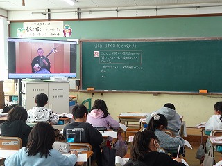 音楽では3学期に入り、「日本の音楽でつながろう」の学習を始めました。日本で親しまれている箏や三味線、三線を演奏されている動画を見て聴いて、そのよさや違いを感じ取りました。