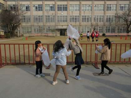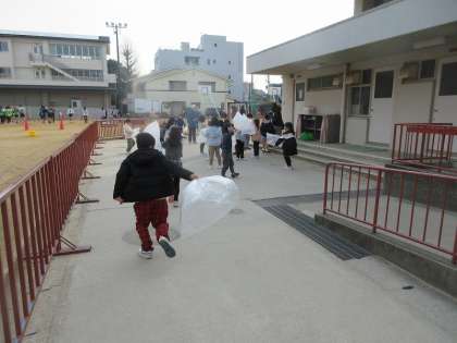 袋の口を拡げて走ったり、空気を集めて口を閉じて風船のようにしたり、遊び方を工夫して楽しんでいました。