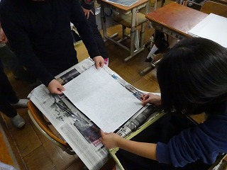 図画工作科「ほってすって見つけて」では、彫刻刀を使って彫り終えた版をインクの量やローラー、バレンの使い方を確かめて、彫った形を刷りました。刷るだけでなく、片付けまで友だち協力して進めることができました。次は刷りあがった作品を交流します。どのような刷りあがりになっているのか、交流の時間が楽しみです。