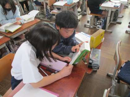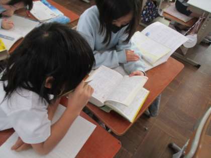 国語科「つたわる言葉で表そう」の学習では、気持ちや様子を表す言葉について学習しています。便利で使いやすい「すごい」などの言葉ではなく、より伝わる言い方がないかを考えました。国語辞典を使って、気持ちや様子を表す言葉をたくさん見つけることができました。