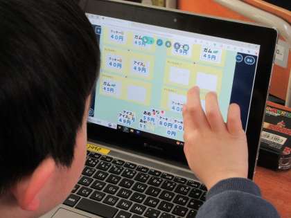 学習したことの力試しとして、タブレットを使って50円2枚で買えるお菓子の組合せを考える問題にチャレンジしました!