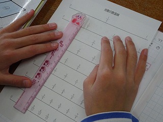分数の学習では、分母や分子の違う分数について、分数の数直線を使って大きさの等しい分数を探すが学習をしました。数直線で表すことで、等しい分数がたくさんあることに気付くことができました。