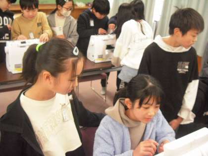家庭科の学習で、ミシンを使ってランチョンマットを作るために、まずミシンの使い方について学習しています。ミシンに糸をかける練習や練習布を縫う練習に取り組んでいます。まっすぐ縫ったり、直角に曲がるように縫ったりする練習をしています。これから、安全に気をつけて、学習を進めていきます。