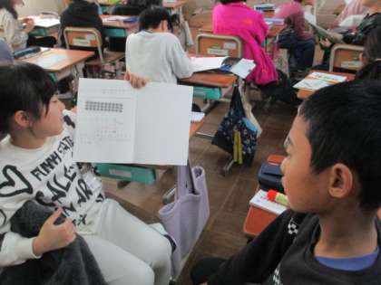 まずは、23×30の計算を考えました。23×3の計算はできるので、23×3×10で考えると、10倍すればよいことに気付きました。図を使って考え、それを使って説明することができました。