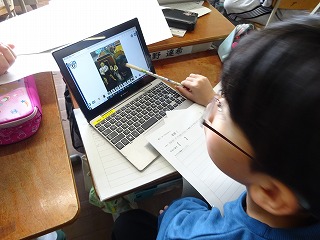 図工「ポーズのひみつ」では、世界や日本で有名な名画や像などの写真を見て、描かれている形や色などから場面の様子を考えたり、ポーズを真似したりしながら、作品のよさを味わいました。