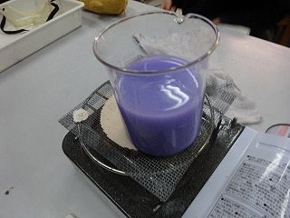 理科「もののあたたまり方」では、サーモインクという熱によって色の変化が分かる液体を使って、水はビーカーのどの部分から変化するのかを予想して実験をして確かめました。