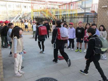 児童会からの取組である「あいさつボランティア」、1年生が担当の日でした。