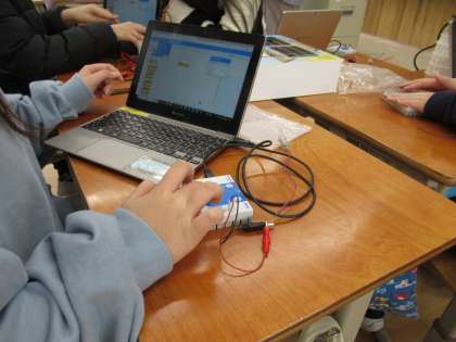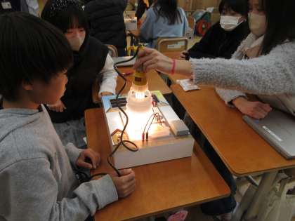 後半の時間には、自分のGIGA端末を使って、プログラミングの学習に取り組みました。人感センサーで明かりをつける等の指令をプログラミングして、電球の明かりを灯したり消したりすることに成功しました。