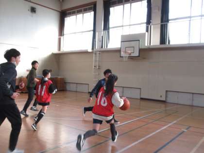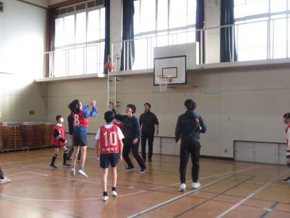 先週の金曜日は、バスケットボール部の最終活動日でした。6年生対教職員で、お別れ試合を行いました。お互いのファインプレーに歓声や拍手がわきおこるなど、なごやかな雰囲気の中で楽しくゲームをすることができました。