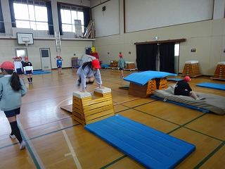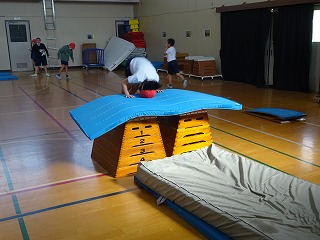 体育「とび箱運動」では、ねらいを達成するために自分で決めた技のポイントを確かめて、場を選んで練習を重ねています。