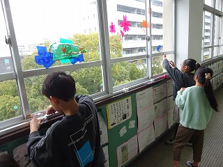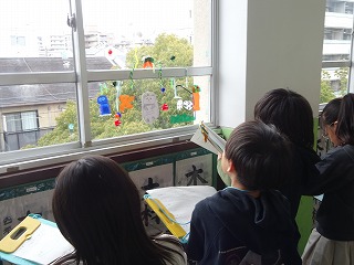 完成した後には、映した形や色を見せ合い、面白さや楽しさを味わいました。天気により、光の入り具合が変わるとどのように変化するのか、しばらく窓を貼っておき、よさを見つけられるようにしたいと考えています。