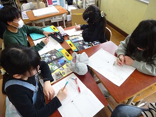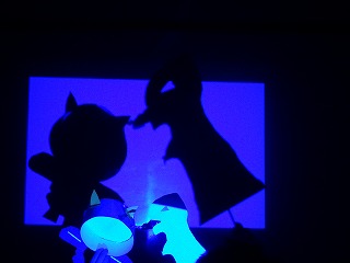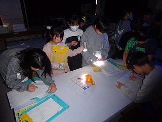 グループで作ったものを暗くした部屋でプロジェクタや懐中電灯の光を当てて、光とかげが作り出す形や色のよさを味わうことできました。