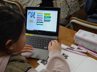 算数「わくわくプログラミング」では、人数を求めるプログラムを作って、増え方を調べました。これまで学習した「変わり方」の学習と関連付けながら、正しくプログラムを作ることで、回数が多くなっても簡単に求めることができることに気付くことができました。
