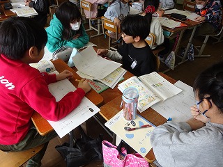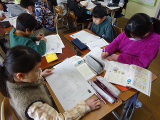 国語「漢字の広場」では、これまで学習した漢字を使って、学級新聞の記事を書きました。どの漢字をどのように使って文にするのかは様々で、交流を通して、よりよい文章にまとめ直して1年間の漢字のまとめをすることができました。