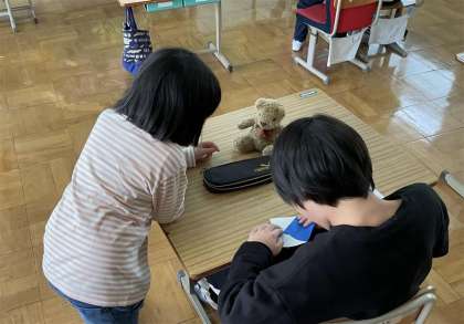 6ねんせいが 1ねんせいに おりがみのつくりかたを おしえていました。