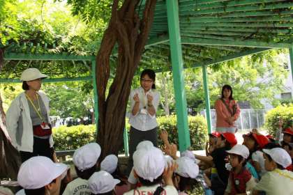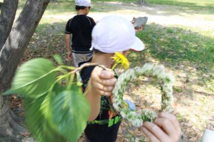 写真は『説明を受けている子どもたち』と『おしろいばなでつくったリング』です。