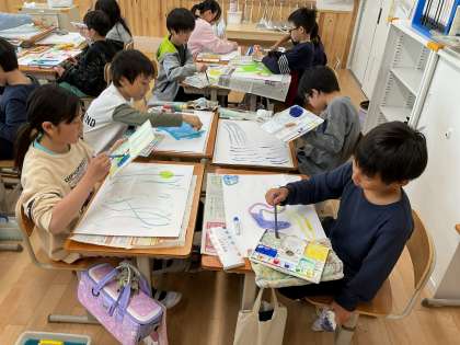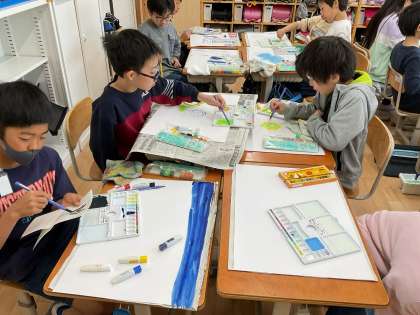 図画工作科の学習で、目には見えない身の回りの音をイメージを広げて絵に表しています。運動場で聞こえる音や、雨の音などに、色があるとしたら…形があるとしたら…と想像を広げて表現しています。どのような作品が完成するのか、今から楽しみです。