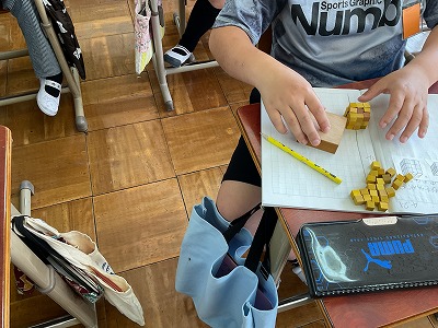 実際に箱が一辺1cmの立方体ブロックが何個分を調べました。「㎤」という新しい単位を学習しました。みんな積極的に学習する姿がすてきです。