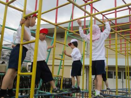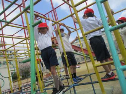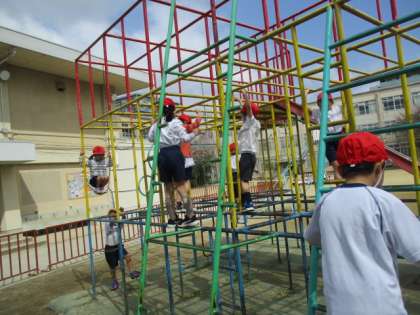 体育の学習で遊具の使い方を学習しました。握るときには親指をかけることや、常に3点は確保すること(手手足、足足手)などに気を付けながら遊具で遊びました。これからも安全に楽しく使ってほしいと思います。