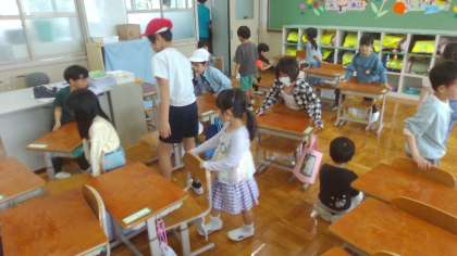 掃除の時間には、自分の掃除の役割を一生懸命にする1年生の姿が見られます。並んでほうきではいたり、雑巾をしたりすることを今は練習しています。6年生が掃除のお手伝いに来てくれるので、1年生もとても喜んでいます。