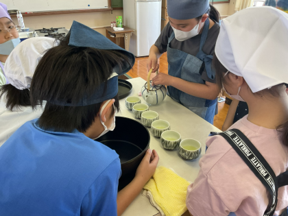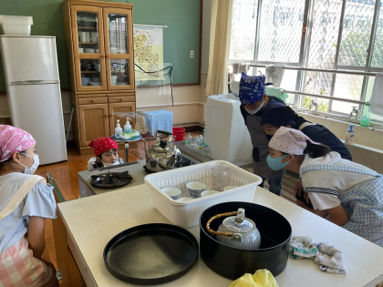 家庭科「私の生活、大発見!」の学習で、お茶を淹れる学習を行いました。ガスの扱いに気を付けて、安全においしいお茶を淹れるために、各グループで協力して行うことができました。