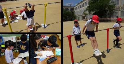 体育では「鉄ぼう運動」の学習を進めています。技カードを活用しながら自分で挑戦したい技を決めて、どのような点に気をつけると技ができるようになるのか、繰り返し練習を進めています。