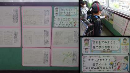連休前より自学自習の取組もスタートしました。担任からコメントをそえたノートをろう下に掲示すると、早速どのような自学ノートが掲示されているのかを見ている姿も見られました。見てマネして、一人一人が目的をもって進んで取り組めるようにしていきます。