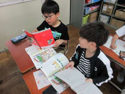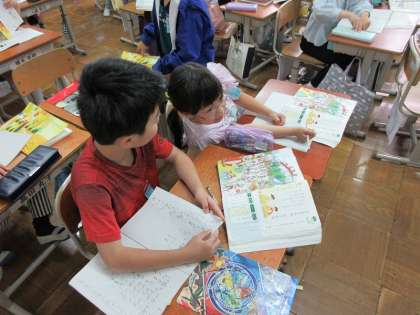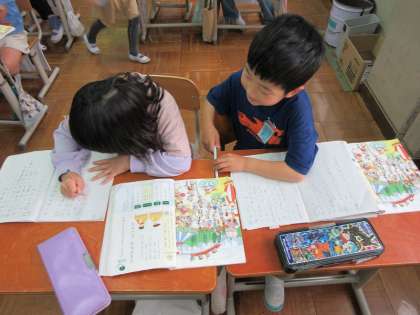 大勢の人が訪れている遊園地の挿絵を見ながら「ともだち」を探す学習を行いました。