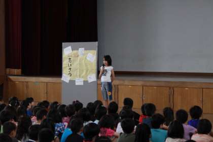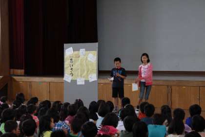 今日の児童会では児童会本部は「自分からすすんで『あいさつ』をしましょう。」と呼びかけていました。