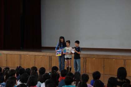 今日の児童朝会では図書委員会と飼育委員会からのお知らせがありました。