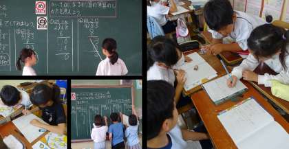 算数「1けたでわるわり算の筆算」の学習では、筆算のしかたを自分で考え、たがいに説明し合って、確かな理解につながるように学習を進めています。