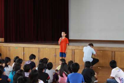 今日の昼休みに全校児童が体育館に集まって『たてわりなかよし会』がありました。