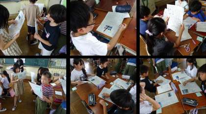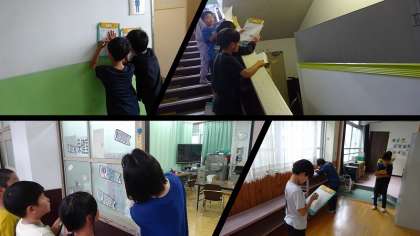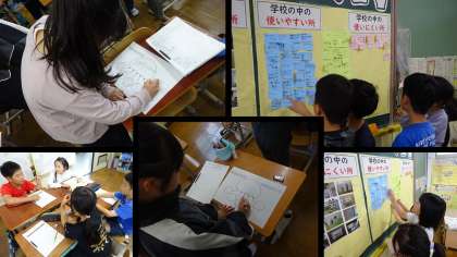 ハナヤ学習「みんながくらしやすいまち」の学習では、学校の中の使いやすい所と使いにくい所を実際に校内を歩いて調べました。普段過ごしている校内を見て回ると、様々な人の立場にたって工夫されていることがたくさん見つかりました。入口の前には手すりやスロープがついていること、車いすが通る十分なスペースがあることなど、じっくり探してみると数多くの発見がありました。日常生活と結び付けながら、さらに詳しく調べていく予定です。