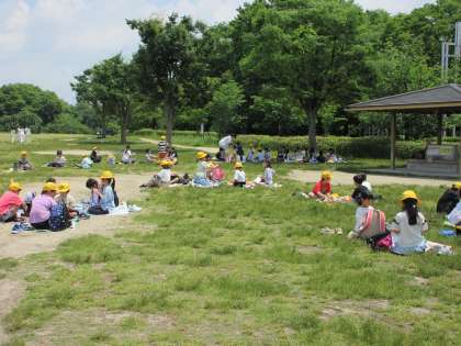 日差しも弱く、心地よい風が吹いていたので、梅小路公園の芝生広場でお弁当を食べました。お家の人に作ってもらったお弁当を頬張る姿はみんな幸せそうでした。朝早くから用意をしてくださり、ありがとうございました。